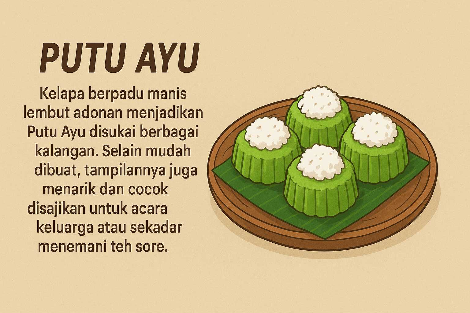 Putu ayu merupakan salah satu jajanan tradisional Indonesia yang hingga kini masih digemari oleh berbagai kalangan. Kue tradisional ini terkenal dengan rasa manis yang lembut, aroma pandan yang khas, serta taburan kelapa parut yang gurih di bagian atasnya. Perpaduan rasa tersebut menjadikan putu ayu sebagai camilan yang pas untuk segala suasana.